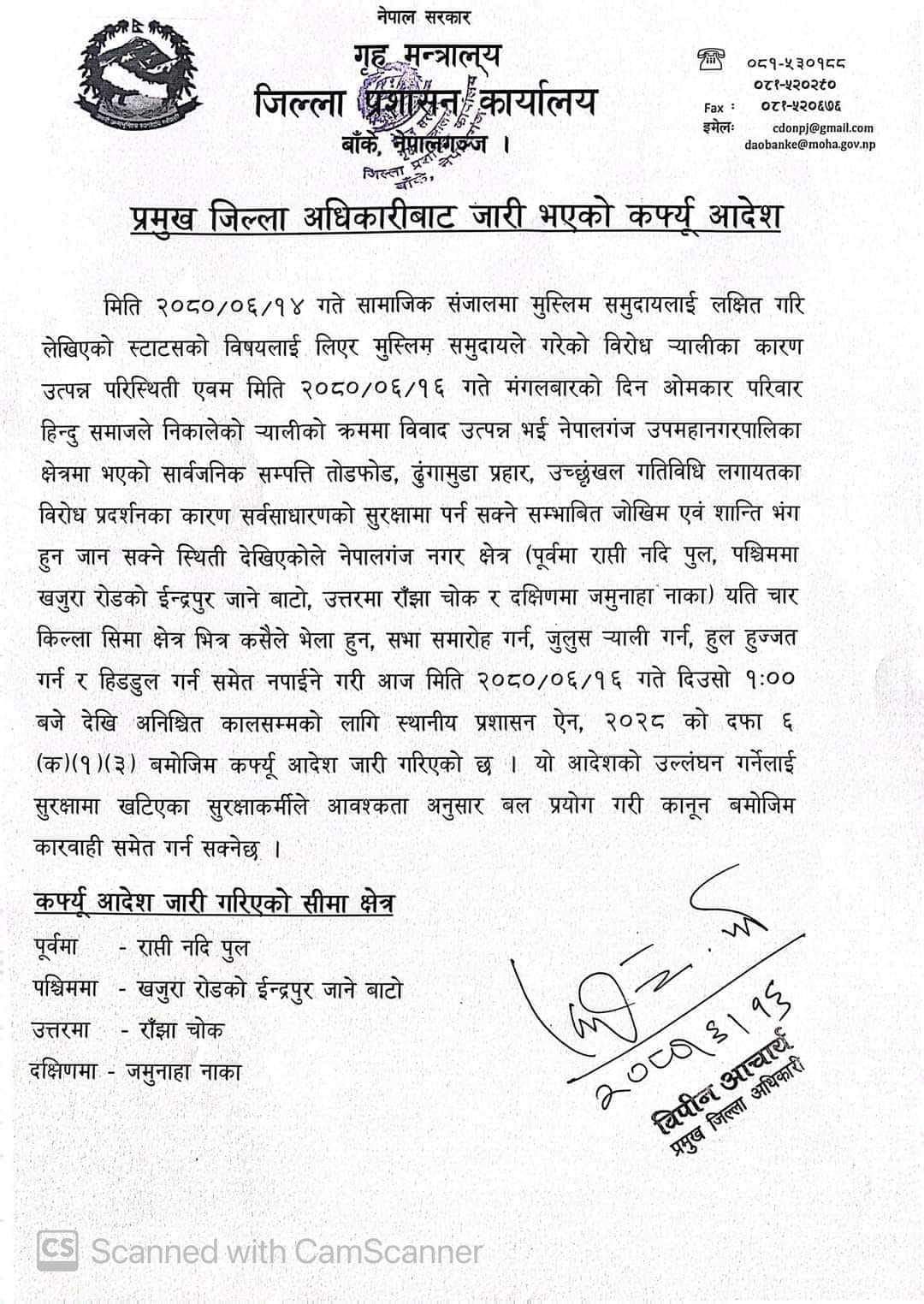पूर्वमा राप्ती नदी पुल, पश्चिममा खजुरा रोडको इन्द्रपुर जाने बाटो, उत्तरमा राँझा चोक र दक्षिणमा जमुनाहा नाकासम्म कर्फ्यु लगाइएको प्रमुख जिल्ला अधिकारी विपीन आचार्यले जारी गरेको सूचनामा उल्लेख छ ।