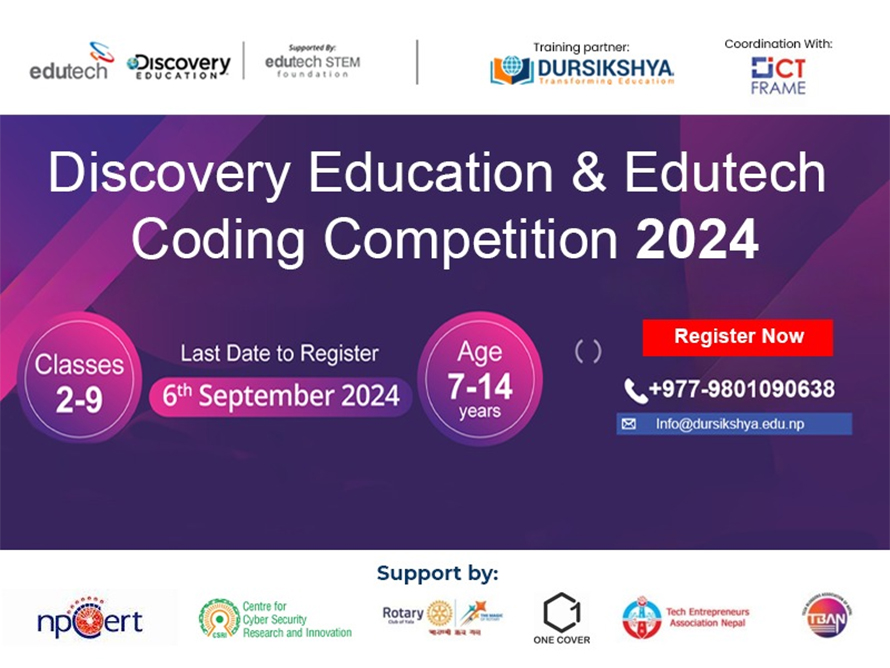 काठमाडौं भदाै २ । बालबालिकाको प्रतिभा प्रष्फुटन गराउनका लागि राष्ट्रिय स्तरको कोडिङ प्रतियोगिता हुने भएको छ । डिस्कभरी एजुकेसन नेटवर्क यूके र एडुटेकको सहयोगमा भदौ २१ गते कोडिङ प्रतियोगिता हुन लागेको दूरशिक्षाका प्रमुख कार्यकारी अधिकृत कृष्ण पाण्डेले बताए ।