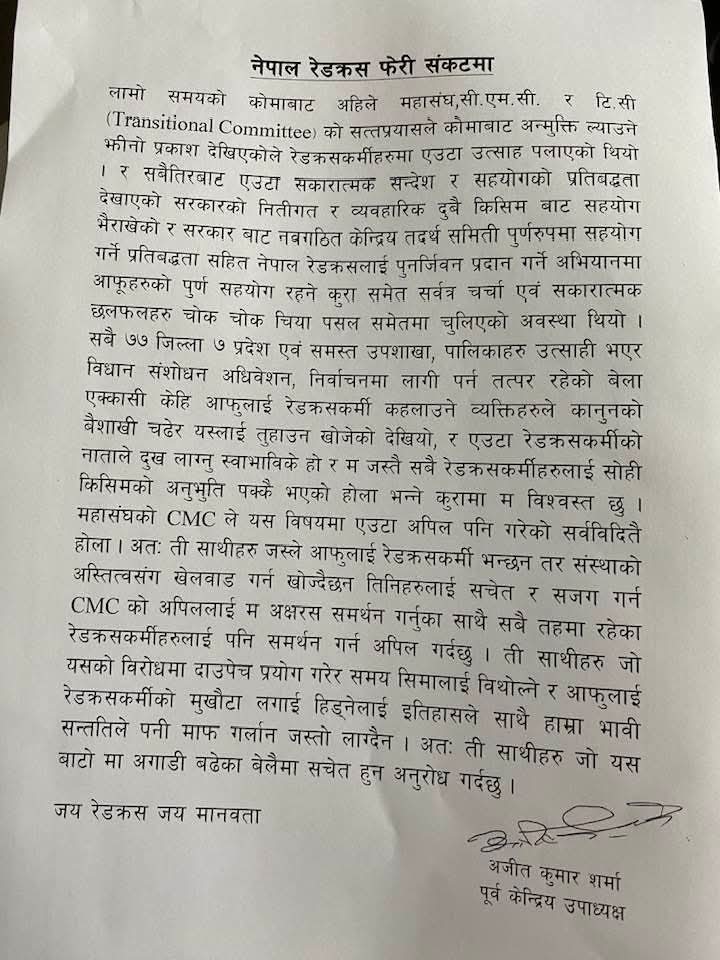पूर्व केन्द्रीय उपाध्यक्ष अजीत कुमार शर्माले एक विज्ञप्ति जारी राख्दै रेडक्रसलाई संकटबाट जोगाउन सबै पक्षलाई गम्भीर बन्न आग्रह गर्न लागेका छन्। उसको मजाकलाई सहजीकरणको बाँडफाँड र महाअधिवेशन तिथीगत रूपमा अगाडिलाई भने, फेरि एकतर्फी कदम राख्छौं।