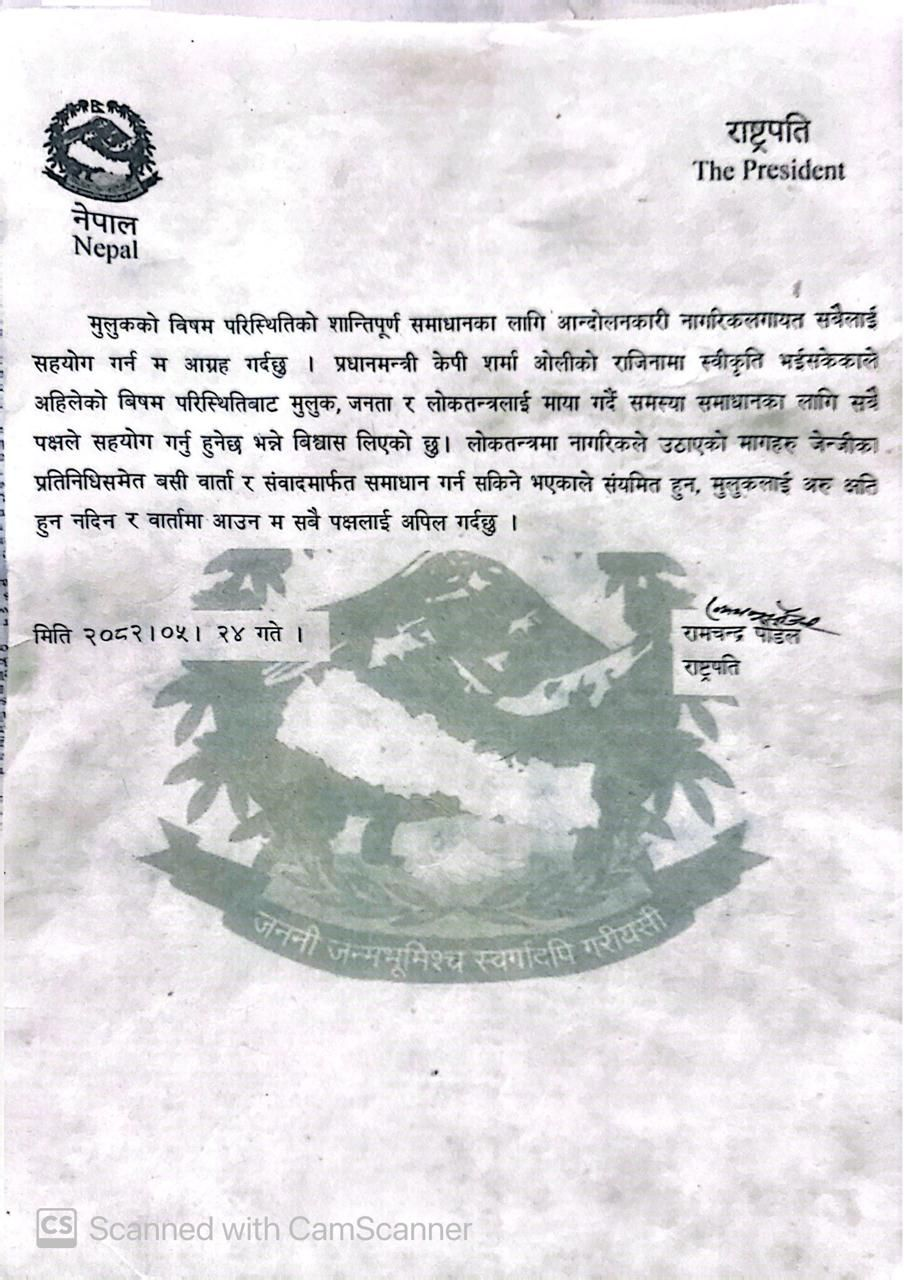 “लोकतन्त्रमा नागरिकले उठाएका माग जेनजीका प्रतिनिधिसमेत बसी वार्ता र संवादमार्फत् समाधान गर्न सकिने भएकाले संयमित हुन, मुलुकलाई अरु थप क्षति हुन नदिन र वार्तामा आउन म सबैलाई अपिल गर्दछु,” राष्ट्रपतिले भनेका छन् ।