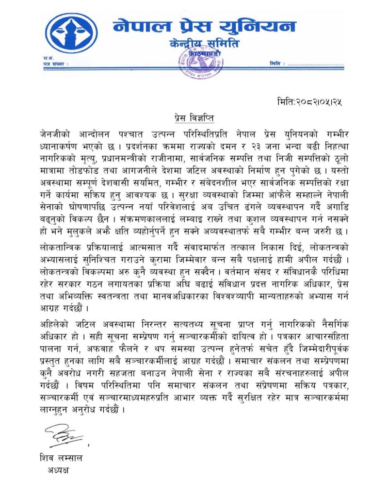 जेनजीको आन्दोलनपछि उत्पन्न जटिल परिस्थितिप्रति गम्भीर चिन्ता व्यक्त गर्दै नेपाल प्रेस युनियनका केन्द्रीय अध्यक्ष शिव लम्सालले जारी गरेको विज्ञप्तिमा आन्दोलनका क्रममा भएको राज्यको दमन, २३ जनाभन्दा बढी निहत्था नागरिकको मृत्यु, प्रधानमन्त्रीको राजीनामा, र सार्वजनिक तथा निजी सम्पत्तिको व्यापक तोडफोडले देश संकटपूर्ण अवस्थामा पुगेको उल्लेख छ। यस्तो अवस्थामा सबै देशवासीलाई संयमित र संवेदनशील भई देशको रक्षा गर्न सक्रिय हुनुपर्नेमा जोड दिइएको छ।