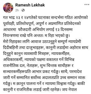 • काठमाडौ चैत्र २७ ।   पूर्वगृहमन्त्री रमेश लेखकले गत भाद्र २३ र २४ गतेको घटनाका सन्दर्भमा गठित आयोगको पूर्वाग्रही, प्रतिशोधपूर्ण, अपूर्ण र अप्रमाणित प्रतिवेदनको आधारमा फौजदारी अभियोग लगाई १३ दिनसम्म नियन्त्रणमा राखे पनि अन्ततः म रिहा भएको छु’, । लेखकले  आफूविरुद्ध लागेको मुद्दामा कानुनी र राजनीतिक लडाइँ जारी रहने बताएका छन् । आफू हिरासतमुक्त भएको जानकारी दिँदै लेखकले बाँकी लडाइँ जारी रहने बताएका छन।