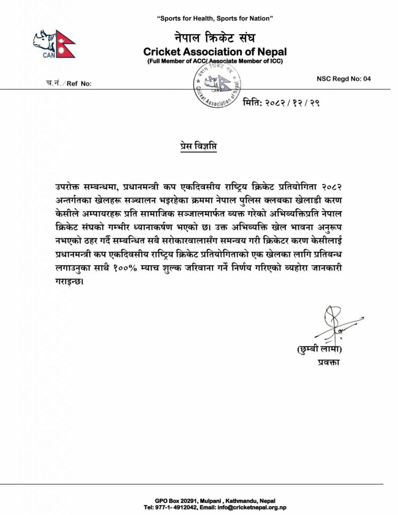 लामाले भने, ‘आईसीसीको खेलाडी आचारसंहिता, क्यानसँगको सम्झौतामा खेलाडीको आचारसंहिता, प्रधानमन्त्री कपको गाइडलाइनभित्र रहेर म्याच रेफ्रीले दिएको रिपोर्टका आधारमा क्यानको प्राविधिक समितिसँग छफल गरेर क्यानले निर्णय लिएका हाे ।’