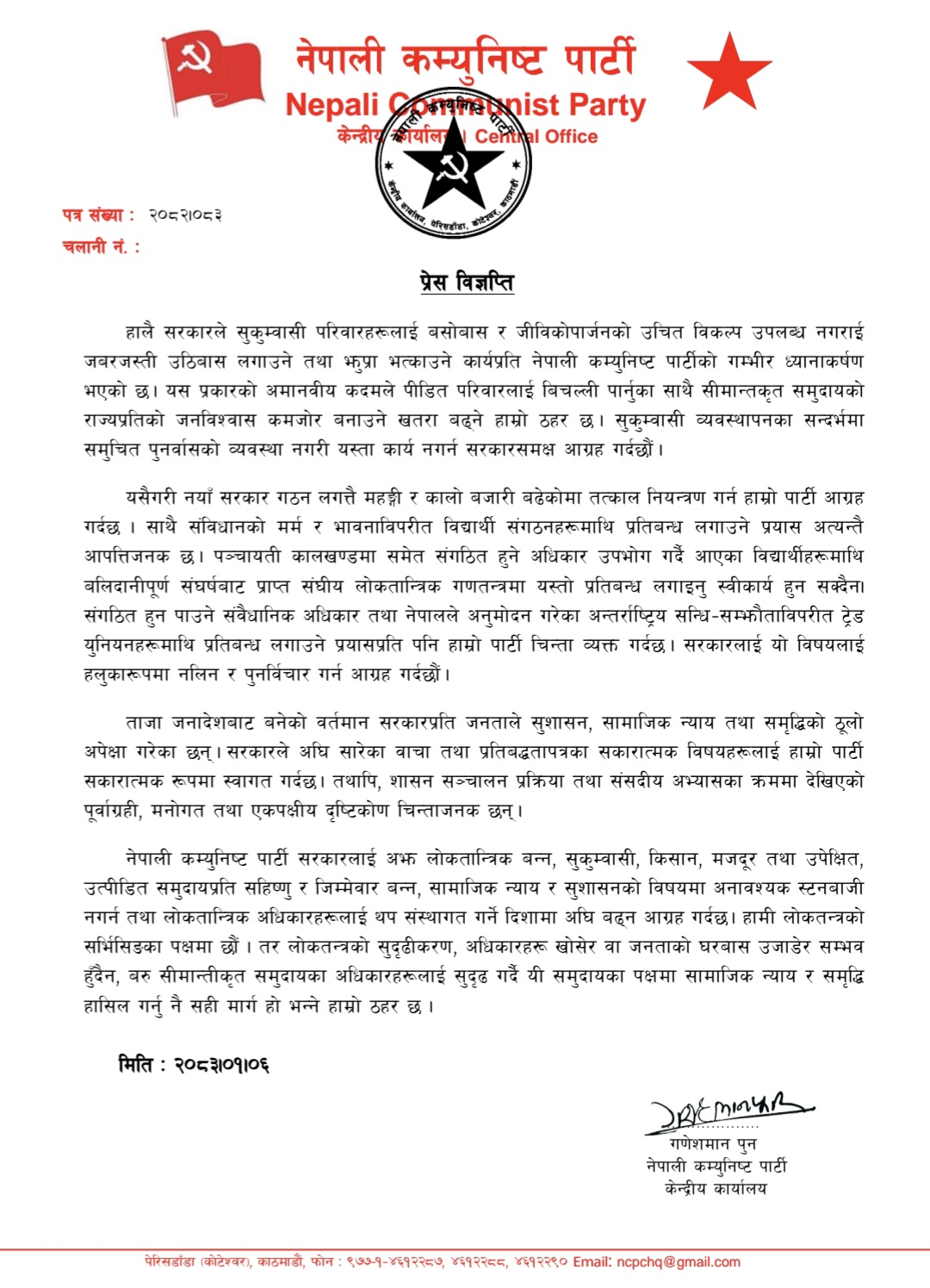 काठमाडौँ । बैशाख ६,। नेपाली कम्युनिष्ट पार्टीले सरकारले हालै देशका विभिन्न स्थानमा सुकुम्बासी परिवारहरूलाई उचित विकल्पबिना उठिबास गराउने तथा झुप्रा भत्काउने कार्य गरेको भन्दै गम्भीर आपत्ति जनाएको छ। पार्टीले आइतबार जारी गरेको प्रेस विज्ञप्तिमा यस्तो कदमलाई “अमानवीय” भन्दै तत्काल रोक्न र पुनर्वासको व्यवस्था गर्न सरकारसँग माग गरेको छ।