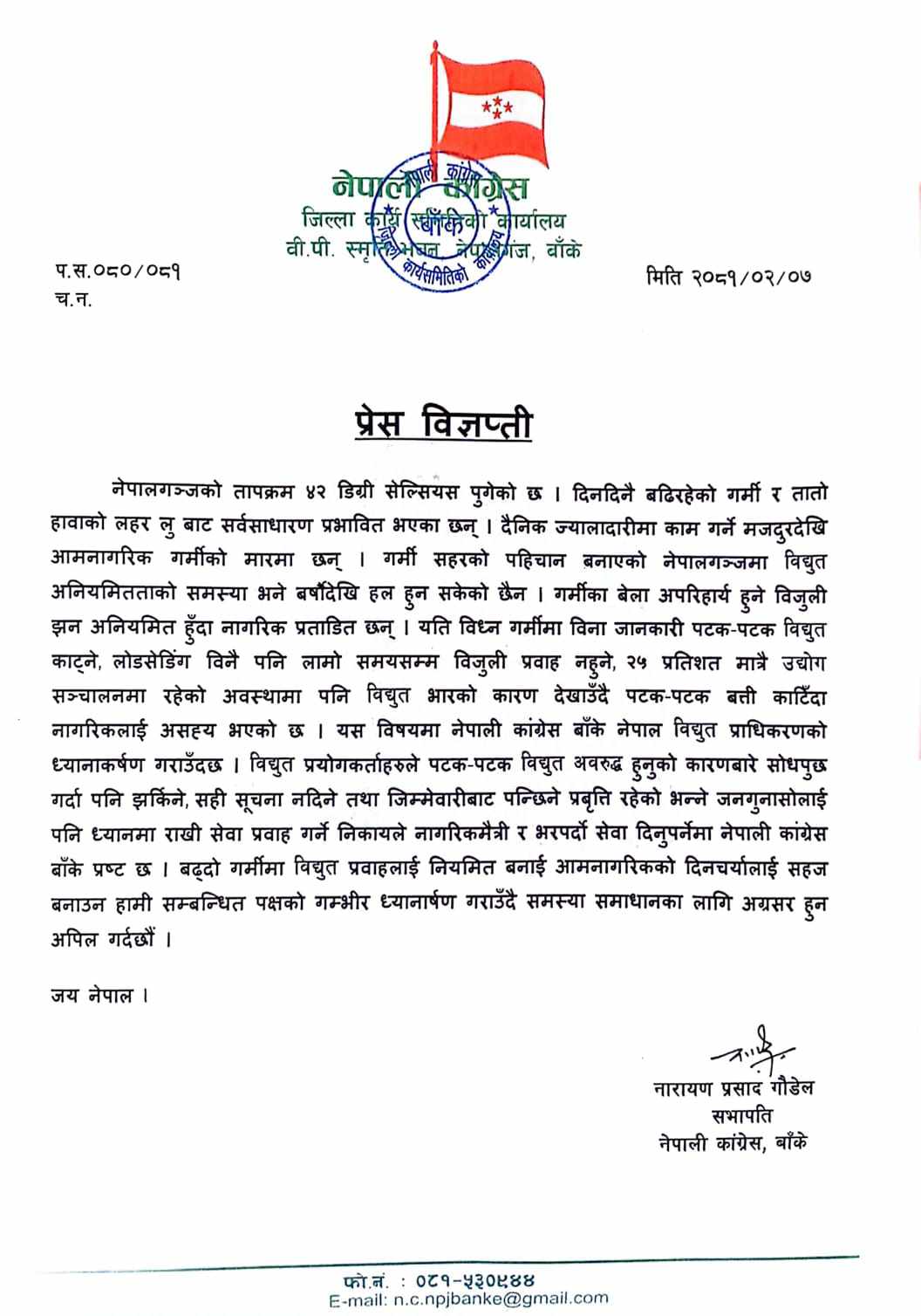 नेपालगन्ज जेष्ठ १९ । अत्यधिक गर्मी बढेपछि बाँकेको नेपालगञ्ज उपमहानगरपालिकाले गर्मी बिदा बढाएको...