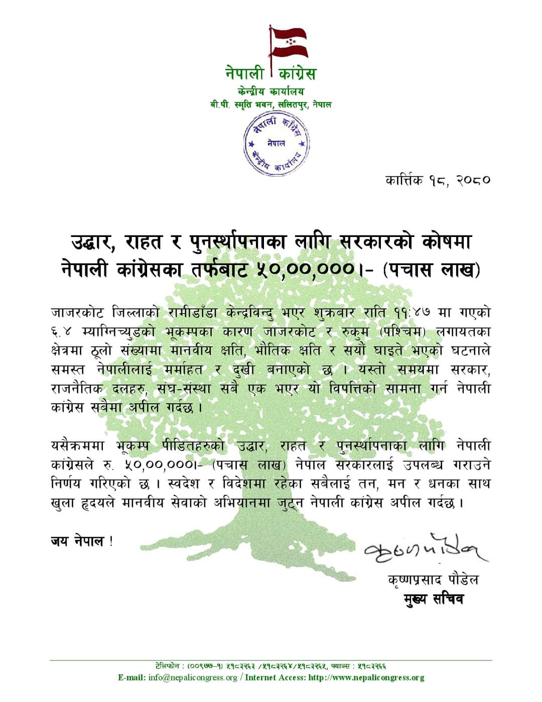 काठमाडौं : नेपाली कांग्रेसले भूकम्प प्रभावितलाई प्रदान गर्न सरकारी कोषमा पचास लाख दिने घोषणा गरेको...