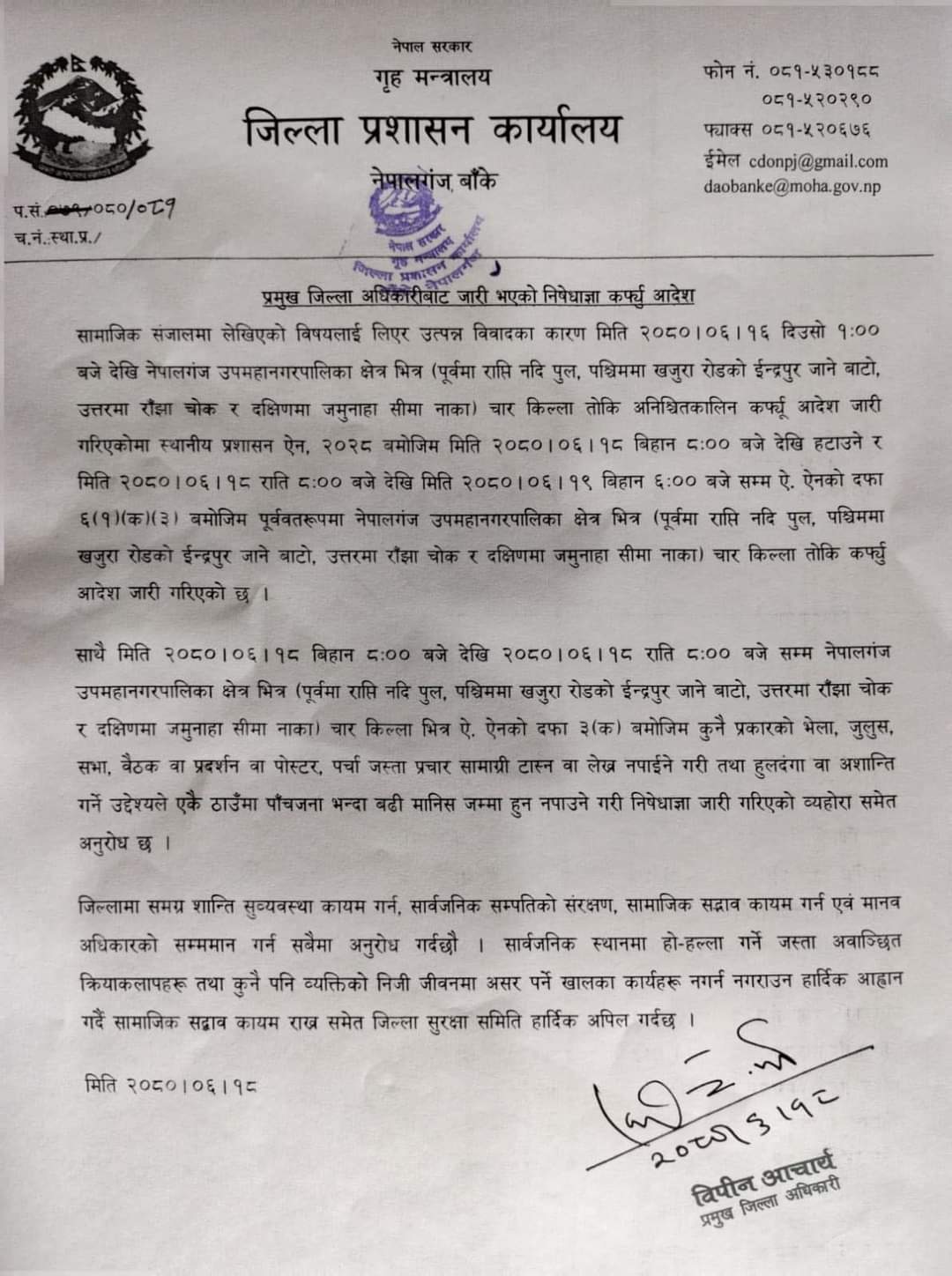 नेपालगन्ज १८ असाेज । बाँकेको नेपालगन्ज उपमहानगरपालिका क्षेत्रमा ३ दिन देखि लगाइएको कर्फ्यु...