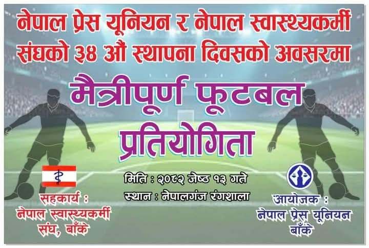 नेपालगञ्ज, जेठ २४ । नेपालगञ्ज उप–महानगरपालिका प्रथम उप मेयर कप फुटसल प्रतियोगिता शनिबार देखि...